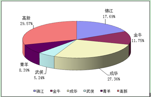 按照行政區(qū)域劃分,2016年第一季度,高新區(qū)和成華區(qū)是新建商品住宅成交量最多的區(qū)域,兩個(gè)區(qū)域成交量占比合計(jì)56.93%,超過全市成交量5成,占有相當(dāng)大的市場比重。這說明城東(東大街沿線和攀成鋼片區(qū))和城南(人民南路沿線和大源、燈塔、清和片區(qū)、天府新區(qū)成都直管區(qū)片區(qū))仍然是商品住宅交易的熱點(diǎn)區(qū)域,這符合成都城市天府新區(qū)的規(guī)劃遠(yuǎn)景和軌道交通的發(fā)展特點(diǎn)。其次為錦江區(qū)、金牛區(qū),成交量較少的區(qū)域?yàn)榍嘌騾^(qū)和武侯區(qū)。詳見表3-1-1、圖3-1-7。
