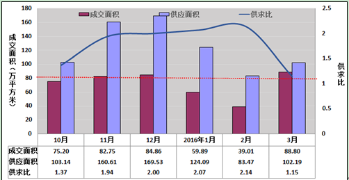 圖3-1-8:2015年10月-2016年3月一圈層新建商品住宅成交供應(yīng)對(duì)比圖
