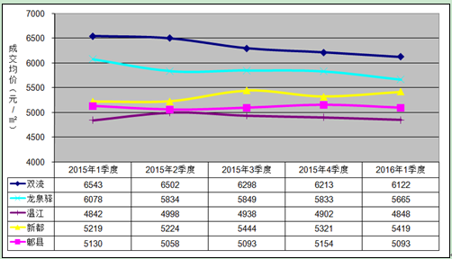 截止2016年3月,二圈層區(qū)縣新建商品住宅成交均價(jià)為5429元/㎡,其中環(huán)比小幅下降1.01%,同比去年下降2.39%,整體來看二圈層房地產(chǎn)市場仍然處于較疲軟的狀態(tài)。二圈層地區(qū)本季度各城市價(jià)格變化趨勢基本一致,除新都環(huán)比上漲1.84%,其他地區(qū)價(jià)格均環(huán)比下降,其中龍泉驛區(qū)降幅最大,環(huán)比下降2.88%。二圈層平均價(jià)格與去年同期相比,除新都區(qū)上漲3.83%外,其余地區(qū)均呈現(xiàn)下降的趨勢,其中龍泉驛區(qū)降幅最大為-6.79%??傮w來看,2016年第一季度二圈層各區(qū)縣成交均價(jià)較上季度有所回落。見圖3-2-1。
