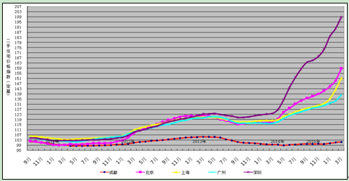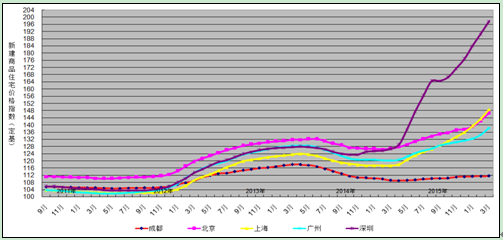圖3-4-1:成都與一線城市新建商品住宅價(jià)格指數(shù)(定基)對(duì)比圖