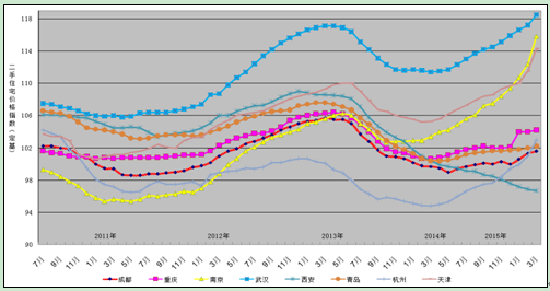 二手住宅價(jià)格指數(shù)方面,2016年3月,70個(gè)大中城市中價(jià)格環(huán)比下降的城市有13個(gè),上漲的城市有54個(gè),持平的城市3個(gè),上漲城市個(gè)數(shù)明顯增加;環(huán)比價(jià)格變動(dòng)最高漲幅為9.3%,最低降幅為0.7%,漲幅明顯上漲。從圖3-4-3可以看出,成都市與全國重點(diǎn)城市的房地產(chǎn)市場運(yùn)行狀況基本一致:自2012年5月止住下滑趨勢后一直穩(wěn)步上漲,2013年3月開始上漲幅度逐漸加大,至同年10月漲幅已有所收窄,從2014年4月開始出現(xiàn)持續(xù)下降,進(jìn)入2015年5月后,二手房市場整體有所回暖, 12月出現(xiàn)小幅下滑,進(jìn)入2016年一季度后又有所回升。相較于其他重點(diǎn)城市,成都二手住宅價(jià)格變化幅度較小,變化相對(duì)平穩(wěn)。見圖3-4-3、圖3-4-4。