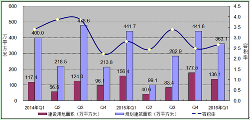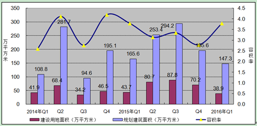 2016年第一季度,成都市一圈層共成交商住用地9宗,較上季度減少8宗,其中商業(yè)用地3宗,居住用地6宗;成交建設(shè)用地總面積約為38.9萬平方米,環(huán)比減少44.64%,同比減少11.07%;規(guī)劃建筑總面積約為147.3萬平方米,環(huán)比減少24.7%,同比減少11.05%。平均容積率為3.79,略高于2010年以來平均容積率3.65。詳見圖4-1-1,圖4-1-2。