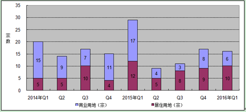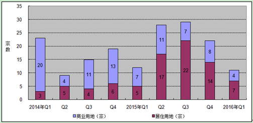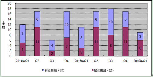 2016年第一季度,全市共流標(biāo)經(jīng)營性用地14宗,較上季度減少19宗,流標(biāo)宗地集中在中心城區(qū)以及新都區(qū)。