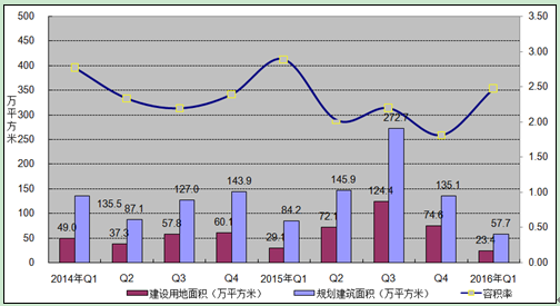 2016年第一季度,成都市三圈層共成交經(jīng)營性用地11宗,較上季度減少11宗,其中商業(yè)用地4宗,居住用地7宗;建設(shè)用地總面積約為23.4萬平方米,環(huán)比減少68.69%,同比減少19.81%,土地成交量環(huán)比有所減少;規(guī)劃建筑總面積約為57.7萬平方米,環(huán)比減少57.31%,同比減少31.5%。容積率水平約為2.41,基本與2011年以來平均容積率2.47持平。詳見圖4-1-5,圖4-1-6。