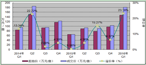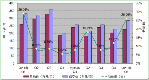 2016年第一季度,成都市一圈層土地成交平均價(jià)格(樓面地價(jià))為5323元/平方米,環(huán)比上漲23.7%,同比下降12.42%;平均起拍價(jià)格為736.91萬/畝;平均成交價(jià)格回升至1072.6萬元/畝,同比下降46.48%,環(huán)比上漲31.46%;平均溢價(jià)率水平為45.55%,較上季度微幅下降0.8%。