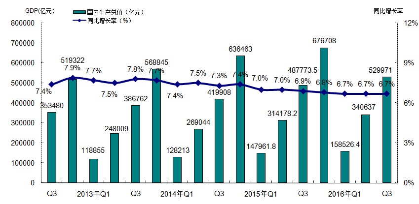 2016年三季度國(guó)內(nèi)生產(chǎn)總值529971億元,同比增長(zhǎng)6.7%,從環(huán)比看,三季度國(guó)內(nèi)生產(chǎn)總值增長(zhǎng)1.8%,增速保持穩(wěn)定,整體呈現(xiàn)基本穩(wěn)定的形勢(shì)。