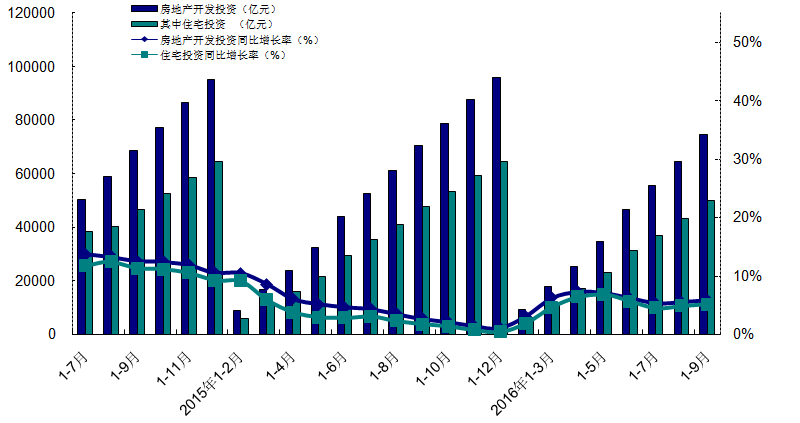 圖1-1-1-2: 2014年第三季度-2016年第三季度全國(guó)房地產(chǎn)開(kāi)發(fā)投資比較圖