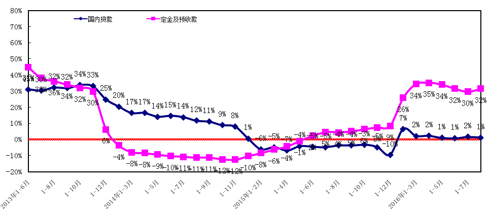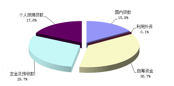 從資金來(lái)源的分布結(jié)構(gòu)看,自籌資金和定金及預(yù)付款仍然為開(kāi)發(fā)企業(yè)主要資金來(lái)源渠道,其兩項(xiàng)占資金來(lái)源比例超過(guò)60%。從占比情況看,2016年第三季度除國(guó)內(nèi)貸款和自籌資金占比小幅下降外,定金及預(yù)收款、個(gè)人按揭貸款、利用外資占比均略有增加。2016年第三季度,除定金及預(yù)付款同比增速略有回落外,其余各項(xiàng)資金來(lái)源渠道增長(zhǎng)率均有小幅的回升。整體來(lái)看,各項(xiàng)資金到位情況基本穩(wěn)定,房產(chǎn)市場(chǎng)平穩(wěn)發(fā)展。詳見(jiàn)圖1-1-2。