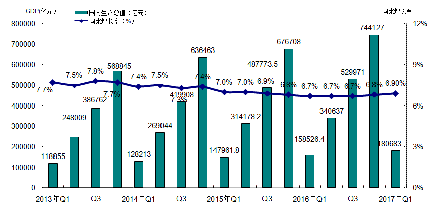 2017年一季度國(guó)內(nèi)生產(chǎn)總值180683億元,同比增長(zhǎng)6.9%,增速較上季度小幅增長(zhǎng)0.1%,整體呈現(xiàn)基本穩(wěn)定的形勢(shì)。
