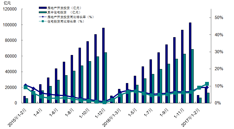 2017年1-3月,全國(guó)固定資產(chǎn)投資(不含農(nóng)戶)93777億元,同比名義增長(zhǎng)9.2 %,增速與1-2月份相比略有回升,上漲0.3個(gè)百分點(diǎn)。房地產(chǎn)開發(fā)投資19292億元,同比名義增長(zhǎng)9.1%,增速比1-2月份上升0.2個(gè)百分點(diǎn)。其中,住宅投資12981億元,增長(zhǎng)11.2%,增速比1-2月上升2.2個(gè)百分點(diǎn),占房地產(chǎn)開發(fā)投資的比重為67.3%。