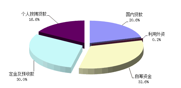 從資金來(lái)源的分布結(jié)構(gòu)看,自籌資金和定金及預(yù)付款仍然為開發(fā)企業(yè)主要資金來(lái)源渠道,其兩項(xiàng)占資金來(lái)源比例超過60%。從占比情況看,2017年第一季度自籌資金、定金及預(yù)付款、個(gè)人按揭貸款占比小幅有所下降,國(guó)內(nèi)貸款、利用外資略有增加。2017年第一季度,除利用外資同比增速明顯回升外,其余各項(xiàng)資金來(lái)源渠道增長(zhǎng)率均有不同程度的回落,尤其是自籌資金,同比增長(zhǎng)率出現(xiàn)負(fù)增長(zhǎng)。整體來(lái)看,各項(xiàng)資金到位情況基本穩(wěn)定,房產(chǎn)市場(chǎng)平穩(wěn)發(fā)展。詳見圖1-1-2。