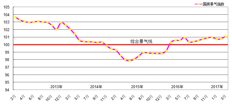 綜上所述,2017年第一季度,經(jīng)濟(jì)增速保持穩(wěn)定,國(guó)家經(jīng)濟(jì)增長(zhǎng)緩中趨穩(wěn),固定資產(chǎn)投資及房地產(chǎn)開發(fā)投資增速基本保持穩(wěn)定。在全國(guó)房地產(chǎn)市場(chǎng)運(yùn)行整體穩(wěn)健,針對(duì)一、二線部分城市房地產(chǎn)市場(chǎng)火熱的狀況,政府出臺(tái)了一系列限購(gòu)、限貸、限賣等政策,一、二線城市房地產(chǎn)市場(chǎng)有所降溫,一、二線房地產(chǎn)市場(chǎng)運(yùn)行整體趨于平穩(wěn),三、四線部分城市房地產(chǎn)市場(chǎng)有所回暖,部分城市仍然有較大的庫(kù)存壓力,平穩(wěn)發(fā)展與去庫(kù)存仍然是房地產(chǎn)市場(chǎng)的主流。在此背景下,國(guó)房景氣指數(shù)在2017年一季度整體有所上漲,漲幅較為平緩。