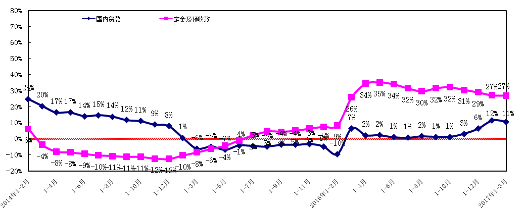 從資金來(lái)源的增長(zhǎng)率來(lái)看,2013年國(guó)內(nèi)貸款增長(zhǎng)率處于高位,平均同比增長(zhǎng)率為29.44%;2014年同比增長(zhǎng)率持續(xù)下降且下降幅度逐漸增大;2015年一季度同比增長(zhǎng)率首次下降為負(fù)值,為近年來(lái)的最低值;三季度開始,房地產(chǎn)國(guó)內(nèi)貸款環(huán)比有所增加,同比增長(zhǎng)率震蕩回升,降幅有所收窄,2016年一季度房地產(chǎn)國(guó)內(nèi)貸款有所增加,同比增長(zhǎng)率回升至正值,從2016年四季度開始,國(guó)內(nèi)貸款同比增長(zhǎng)率保持穩(wěn)定上漲,2017年一季度國(guó)內(nèi)貸款增長(zhǎng)率有所回升,上漲至10.7%,。