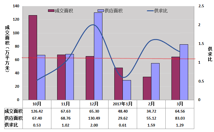 圖3-1-7:2016年10月-2017年3月一圈層新建商品住宅成交供應(yīng)對(duì)比圖