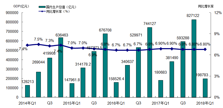 2018年一季度國(guó)內(nèi)生產(chǎn)總值198783億元,同比增長(zhǎng)6.8%,增速持續(xù)保持平穩(wěn),整體來(lái)看GDP增速穩(wěn)定,國(guó)內(nèi)經(jīng)濟(jì)水平穩(wěn)步增長(zhǎng)。
