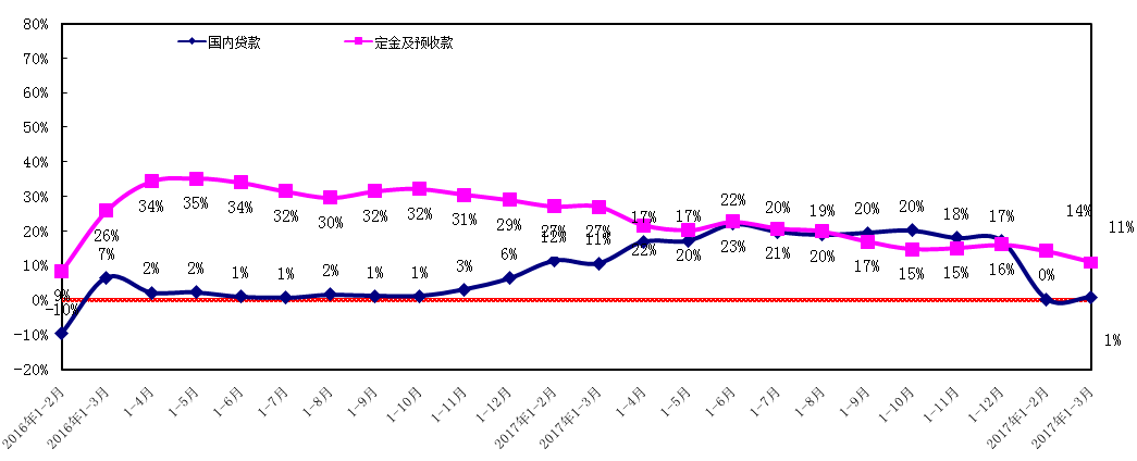 圖1-1-3: 2016年第1季度-2018年第1季度全國(guó)房地產(chǎn)開(kāi)發(fā)企業(yè)資金增長(zhǎng)率比較圖