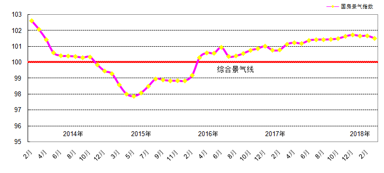 圖1-1-4: 2014年1季度-2018年1季度年全國(guó)房地產(chǎn)開(kāi)發(fā)綜合景氣指數(shù)對(duì)比圖