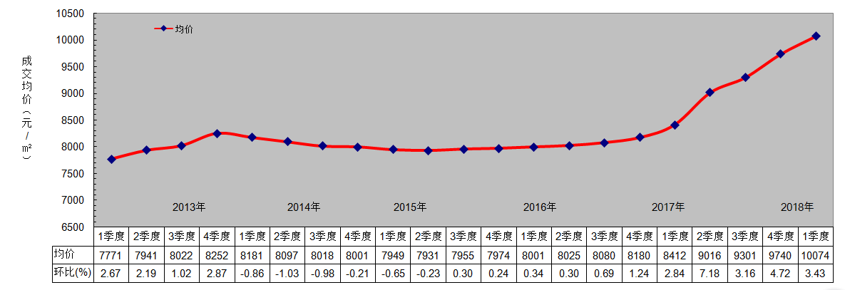 2018年第一季度,根據(jù)我公司在中心城區(qū)均勻布設(shè)的176個(gè)商品住宅交易樣本點(diǎn)數(shù)據(jù),中心城區(qū)商品住宅成交均價(jià)延續(xù)了上季度回暖的趨勢(shì),本季度商品住宅成交價(jià)格有所上漲,漲幅較上季度有所收窄,截止2018年3月,成交均價(jià)為,10074元/平方米,環(huán)比上漲3.43%,同比去年上漲19.76%,同比、環(huán)比均有所上漲。2013年成都市房產(chǎn)市場(chǎng)開(kāi)始回暖,呈現(xiàn)持續(xù)回升態(tài)勢(shì),但漲幅持續(xù)收窄;2014年全國(guó)房地產(chǎn)市場(chǎng)整體不景氣,造成成交均價(jià)持續(xù)小幅下降;2015年上半年,房地產(chǎn)延續(xù)了2014年不景氣的狀況,房?jī)r(jià)持續(xù)下降,但降幅明顯收窄,而2015年下半年開(kāi)始隨著“降準(zhǔn)”“降息”、下調(diào)購(gòu)房首付比例等一系列利好措施的頒布,成都市房地產(chǎn)市場(chǎng)開(kāi)始企穩(wěn)回升;進(jìn)入2016年,在政府一系列利好措施的推動(dòng)下,成都市房?jī)r(jià)持續(xù)上漲至今。根據(jù)國(guó)家統(tǒng)計(jì)局公布的“七十個(gè)大中城市住宅銷(xiāo)售價(jià)格指數(shù)”中成都新建商品房房?jī)r(jià)指數(shù)統(tǒng)計(jì)顯示,成都市自2014年5月開(kāi)始銷(xiāo)售價(jià)格指數(shù)持續(xù)下行,到了10月降幅逐漸收窄,下降趨勢(shì)一直延續(xù)到2015年4月,自5月開(kāi)始銷(xiāo)售價(jià)格環(huán)比止跌上漲,漲勢(shì)一直延續(xù)至2016年三季度,均呈現(xiàn)緩慢上升的趨勢(shì),而三季度價(jià)格指數(shù)漲幅明顯回升,到2016年四季度成都市新建商品房?jī)r(jià)指數(shù)出現(xiàn)小幅下滑,下滑趨勢(shì)延續(xù)至2017年三季度,2017年四季度,成都市新建商品房?jī)r(jià)指數(shù)出現(xiàn)波動(dòng)上漲,,在2018年1季度,新建商品住宅價(jià)格指數(shù)整體穩(wěn)定,小幅上漲,而二手住宅價(jià)格指數(shù)在2018年1季度出現(xiàn)小幅下滑的趨勢(shì)。見(jiàn)圖3-1-4、圖3-1-5。