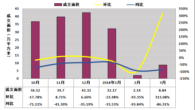 2018年第一季度,新建商品住宅季度總成交43.15萬(wàn)平方米,環(huán)比減少63.6%,同比減少70.78%,成交量下滑趨勢(shì)明顯。月度來(lái)看,月份新建商品住宅成交量較2017年12月份有所下滑,2月受供應(yīng)量減少以及“春節(jié)”和“搖號(hào)選房”、“調(diào)控政策”持續(xù)進(jìn)行的影響,成交量明顯下滑,3月份較2月份有所上漲,但成交量仍處于較低的水平。從整體上看,本季度新建商品住宅成交量明顯出現(xiàn)下滑,成交量明顯減少。預(yù)計(jì)2018年二季度,成都市新建商品住宅成交量或有所回升,房地產(chǎn)市場(chǎng)整體仍然會(huì)以穩(wěn)定運(yùn)行為主。見(jiàn)圖3-1-3。