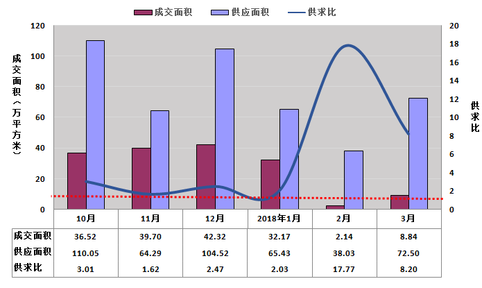 圖3-1-6:2017年10月-2018年3月一圈層新建商品住宅成交供應(yīng)對(duì)比圖